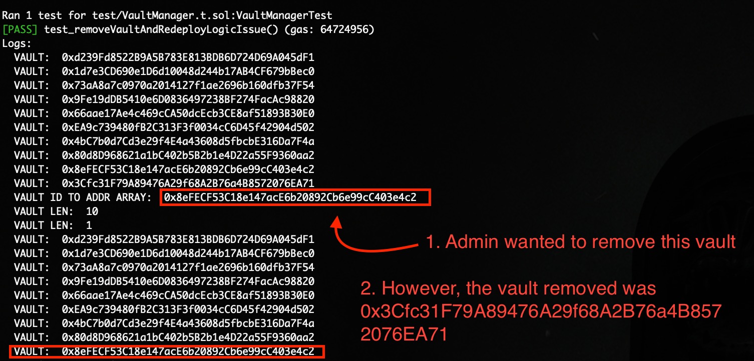 vaultManager.removeVault(vaultAddress[9], keccak256(abi.encode("Test", 8))); //admin wanted to remove the vault ID 8, however the vault removed was vault 9.